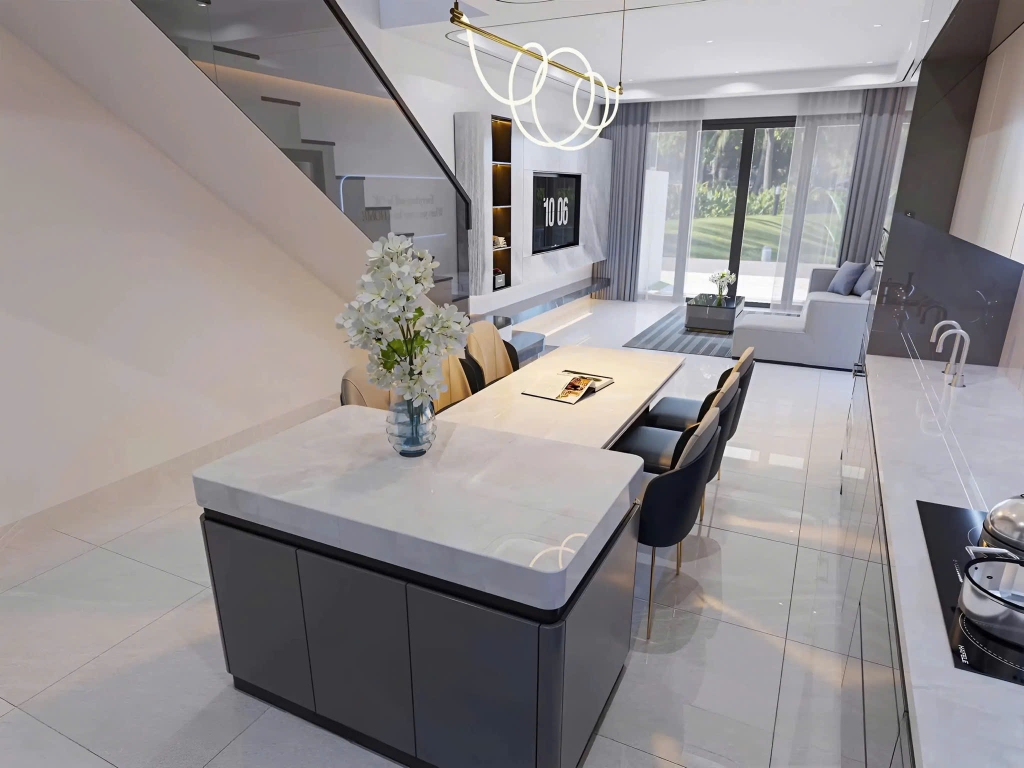 - Bếp và phòng ăn: Khu vực bếp được trang bị đầy đủ tiện nghi, giúp bạn dễ dàng chuẩn bị những bữa ăn ngon cho gia đình. Phòng ăn được bố trí gần bếp, tạo sự thuận tiện trong quá trình sử dụng.