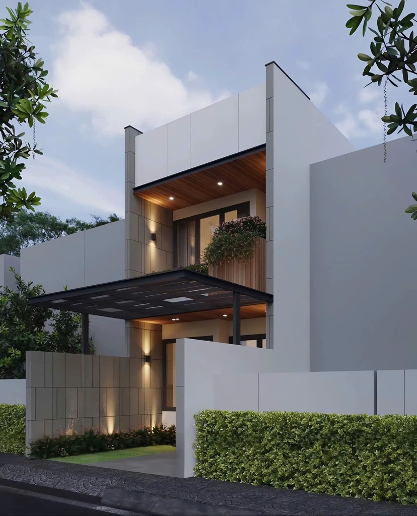 - Mặt tiền ấn tượng: Thiết kế mặt tiền sử dụng các đường nét kiến trúc mạnh mẽ, kết hợp với vật liệu hiện đại như kính, gỗ và đá tự nhiên, tạo nên vẻ đẹp sang trọng và thu hút.