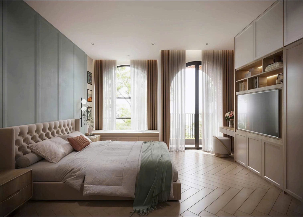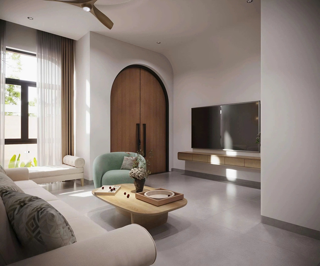 Bên trong, không gian được bố trí khoa học, liên kết chặt chẽ giữa các khu vực chức năng. Phòng khách, bếp và phòng ăn thường được thiết kế liên thông, tạo cảm giác rộng rãi, thoáng đãng. Các phòng ngủ được bố trí ở tầng trên, đảm bảo sự riêng tư và yên tĩnh.