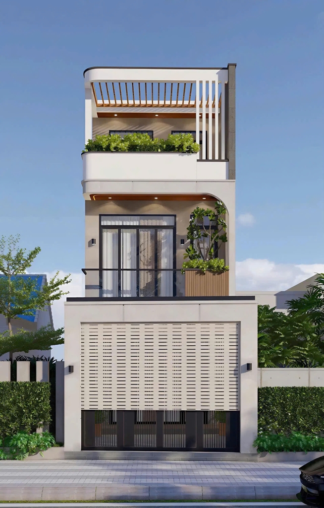 Kiến trúc hiện đại: Đường nét vuông vức, gọn gàng, kết hợp lam gỗ và mảng xanh tinh tế.