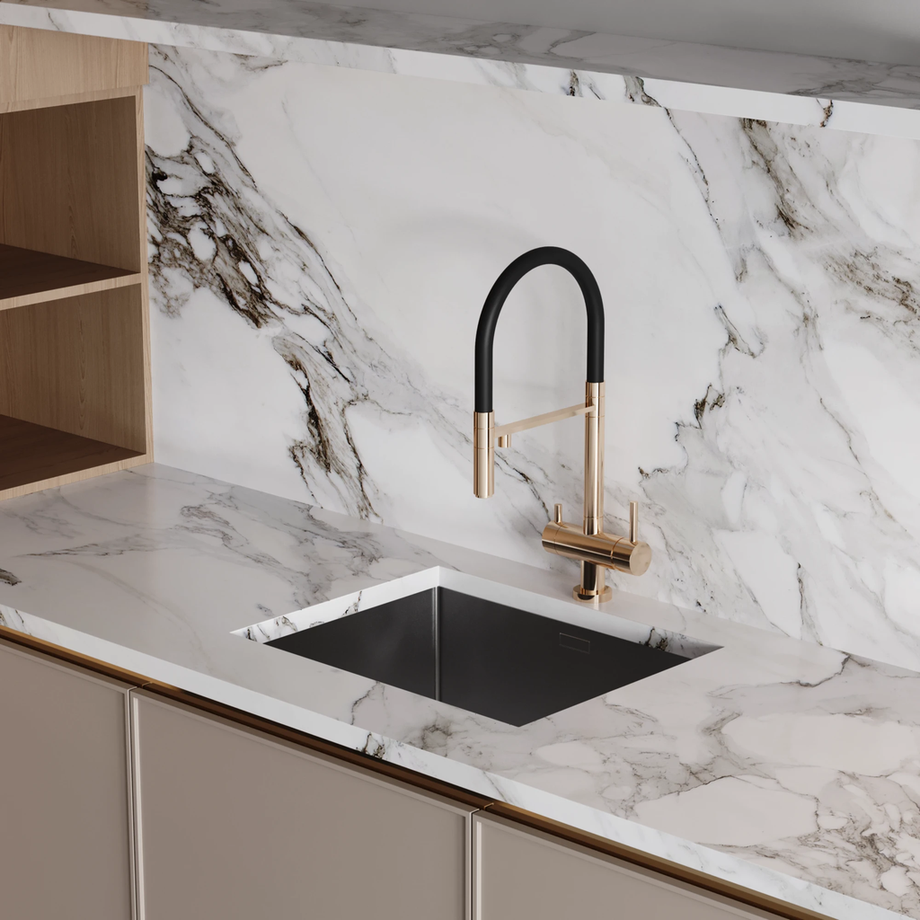 – Vòi & chậu rửa mạ PVD vàng cao cấp, đồng bộ tổng thể.