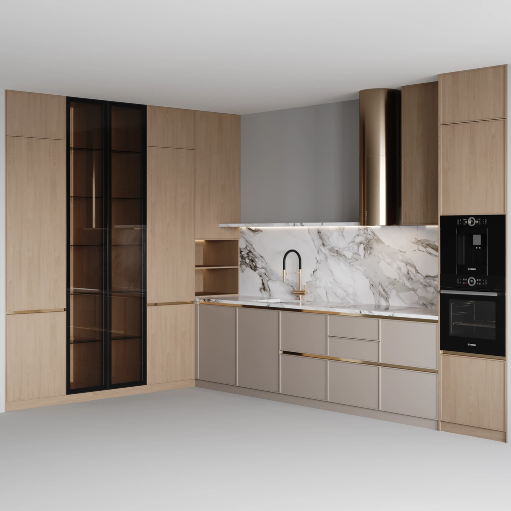 🔹 Màu sắc: Phối màu be trung tính & veneer vân gỗ sáng, kết hợp tay nắm âm vàng ánh kim sang trọng.